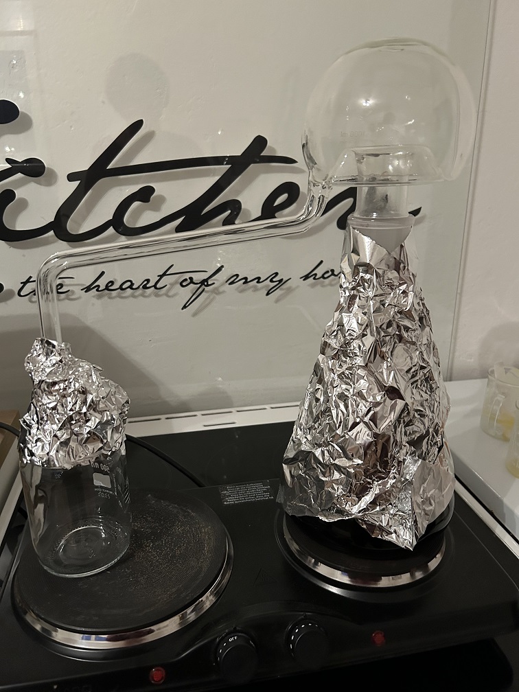 Die Spagyrische Tinktur sollte erhöht werden zu einer (fast) Essenz. Die Botschaft war klar. Also nicht nur kalzinieren sondern auch destillieren war angesagt.